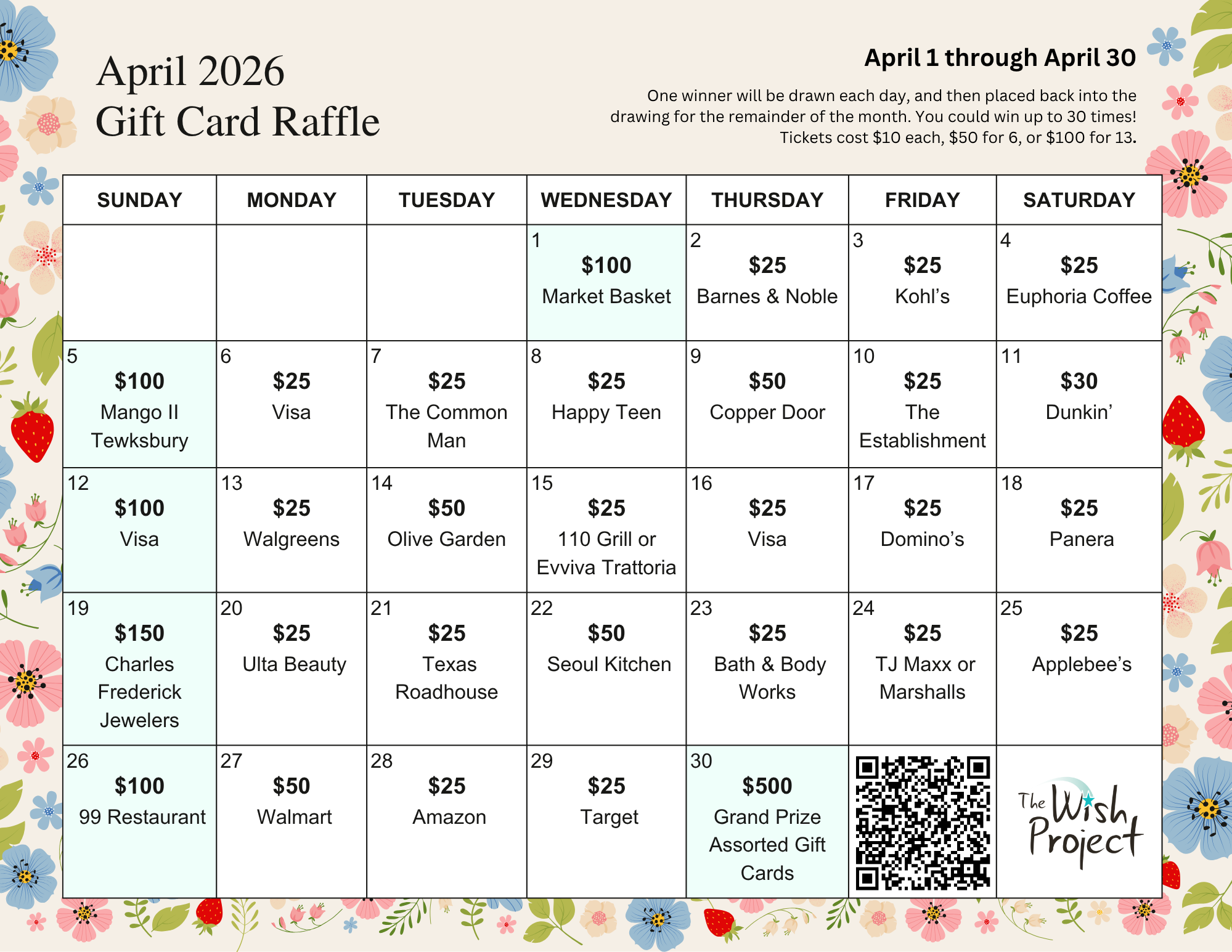 Who doesn’t love a good raffle? With our Gift Card Raffle, one winner will be drawn each day, and then placed back into the drawing for the remainder of the month. With some luck, you could win up to 30 times! Tickets cost $10 each, $50 for 6, or $100 for 13. Scroll down to see what you could win!